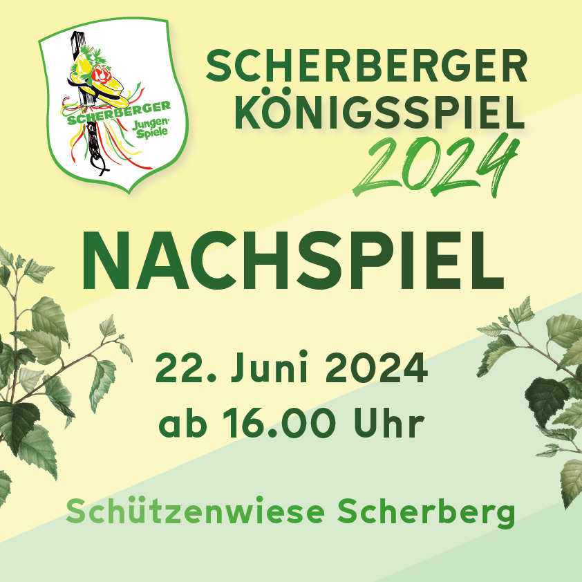 Das Nachspiel des Scherberger Königsspiels findet am 8. Juli 2017, ab 16.00 Uhr, auf dem Schulhof der Grundschule Scherberg statt. Geboten werden neben Kaffee und Kuchen, Spezialitäten vom Grill und natürlich Frisches vom Fass.